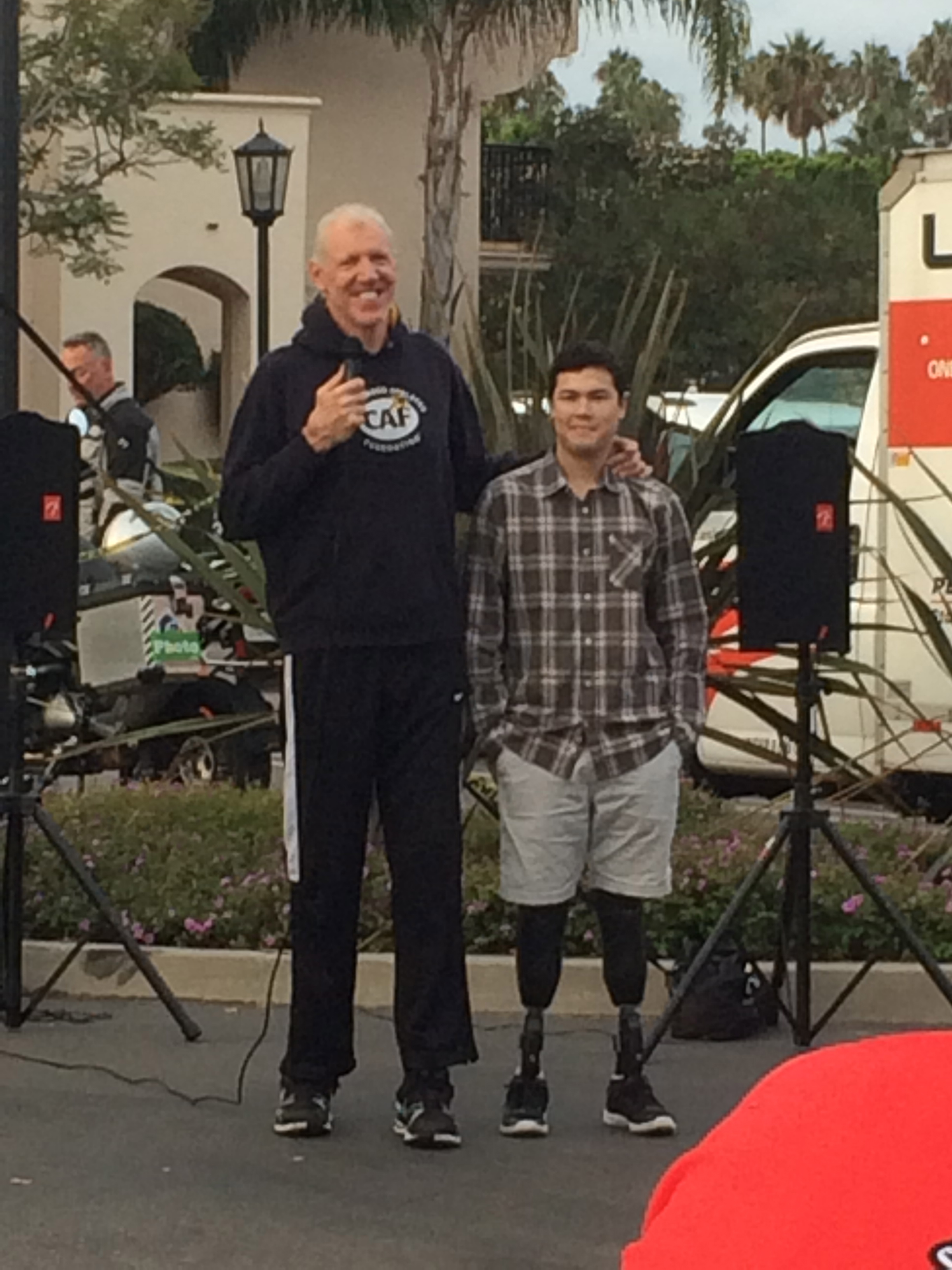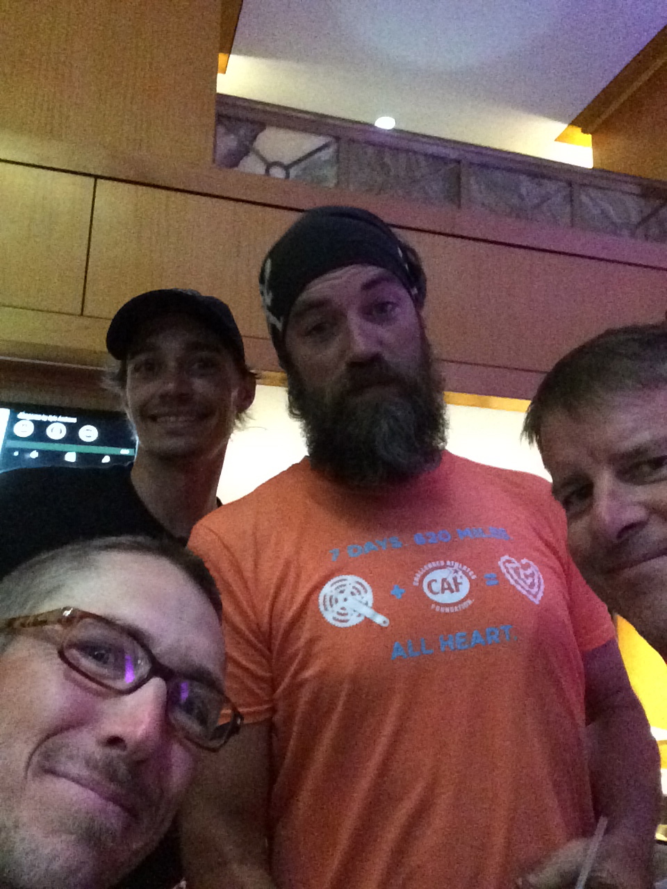 Everyday we have a local CA grant recipient (not doing the ride) come and tell us their story. Today was a 19 yr old Santa Barbara man who was out surfing about a year ago and didn’t feel well. He went home and his room mates knew it was something serious so they took him to the ER. Meningitis. The next day they amputated both his legs. One day a robust 19yr old surfing next day a double amputee. Well here he is with Bill today approx 1 year from the surgery. He has his new legs and is out riding up and running a storm while attending UCSB.